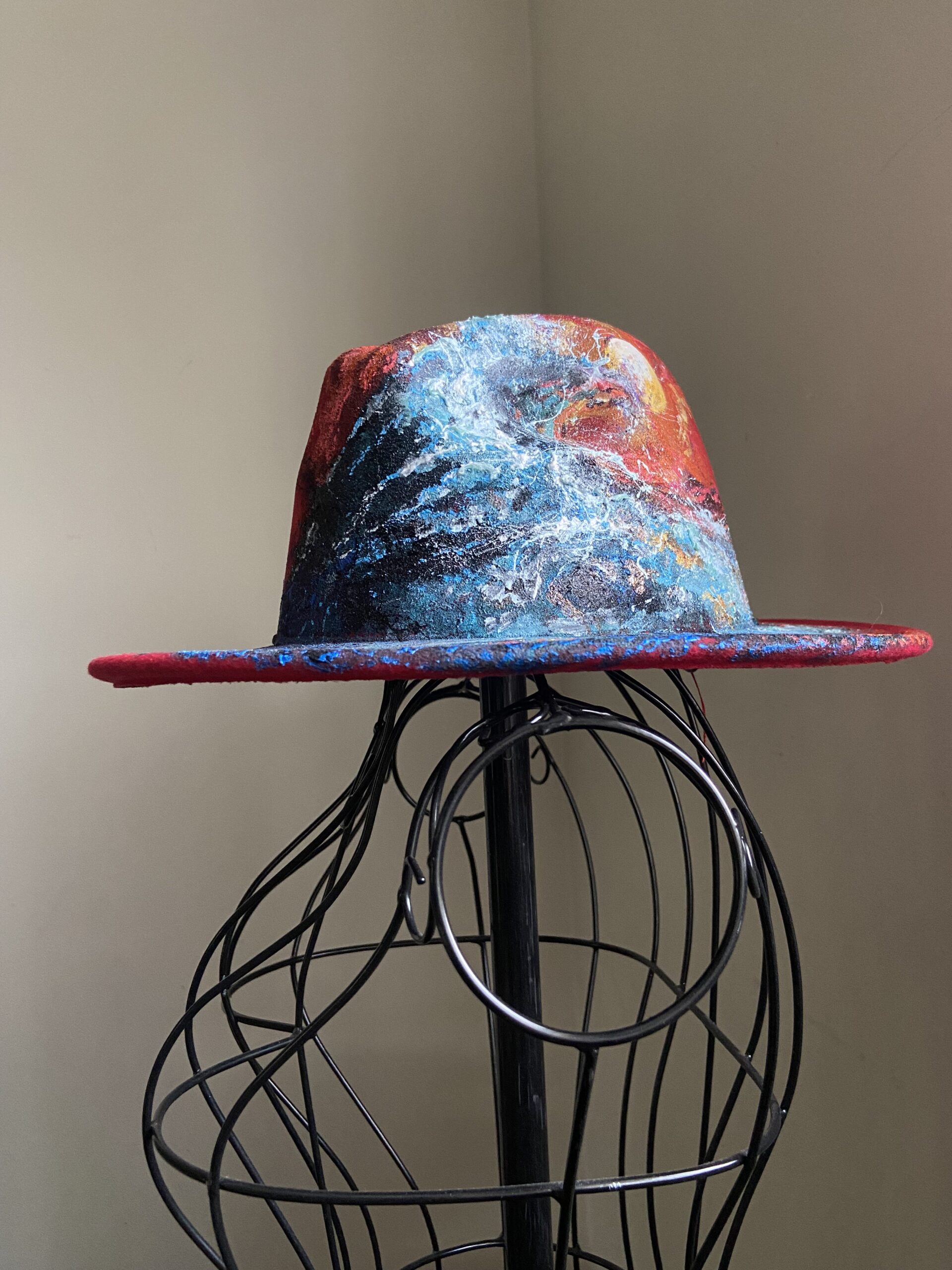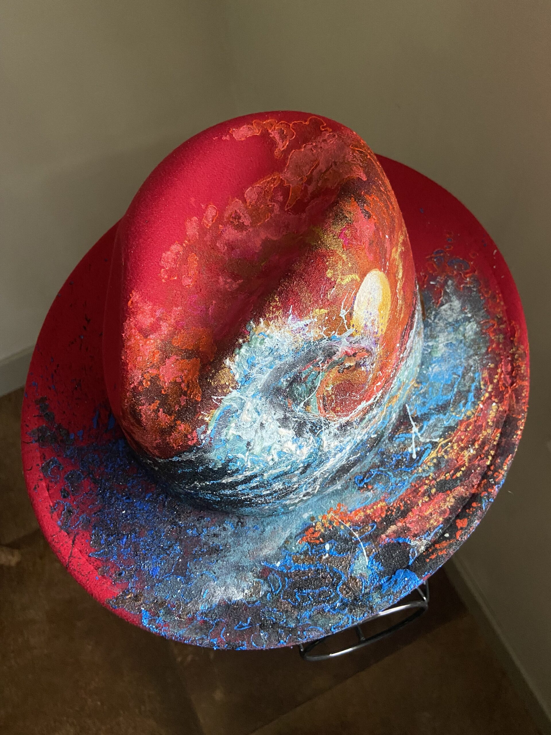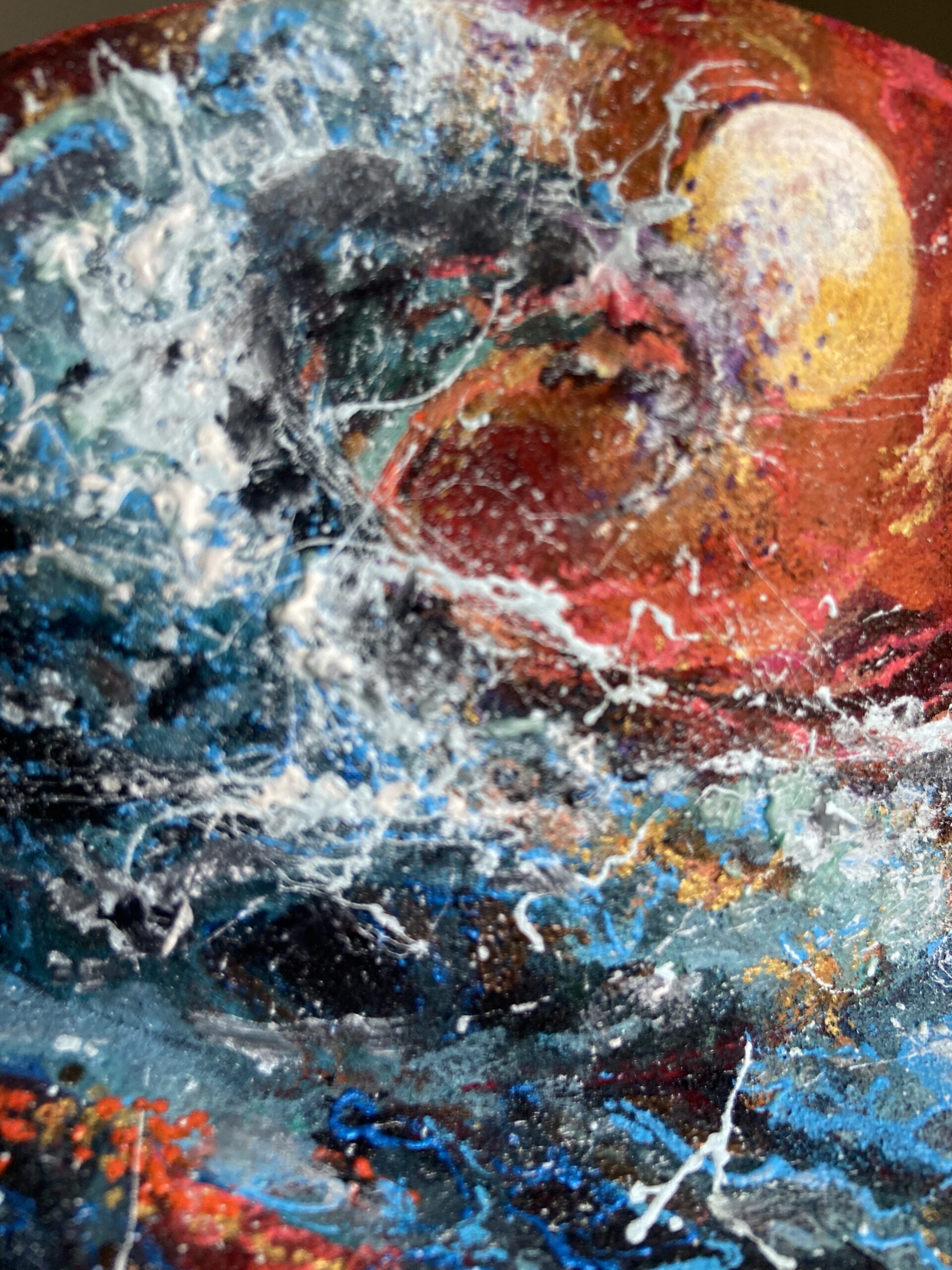 Vienetinis rankomis tapytas aksesuaras, kur spalvos pasakoja savo istoriją: raudonas debesuotas dangus, šėlstančios tamsiai mėlynos bangos ir ryški geltona saulė kuria harmoniją, kuri traukia žvilgsnį.